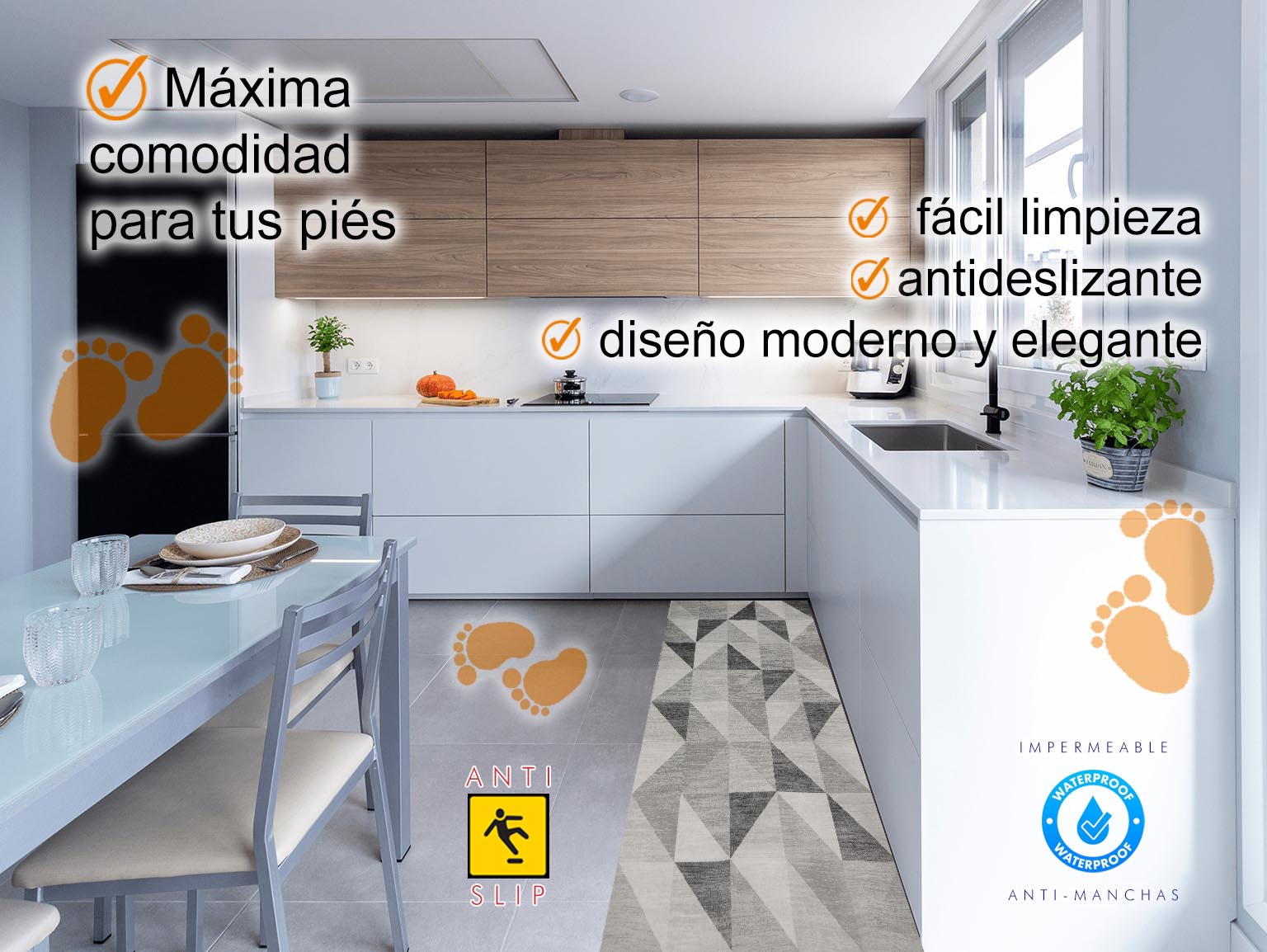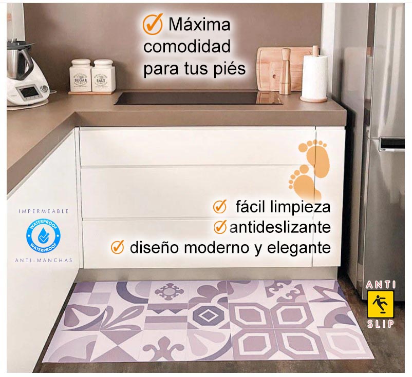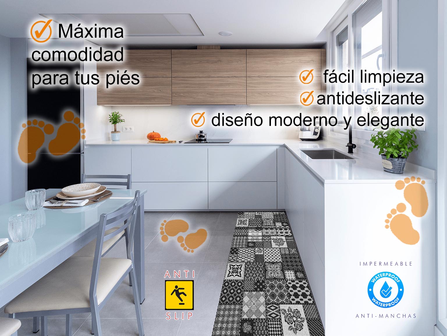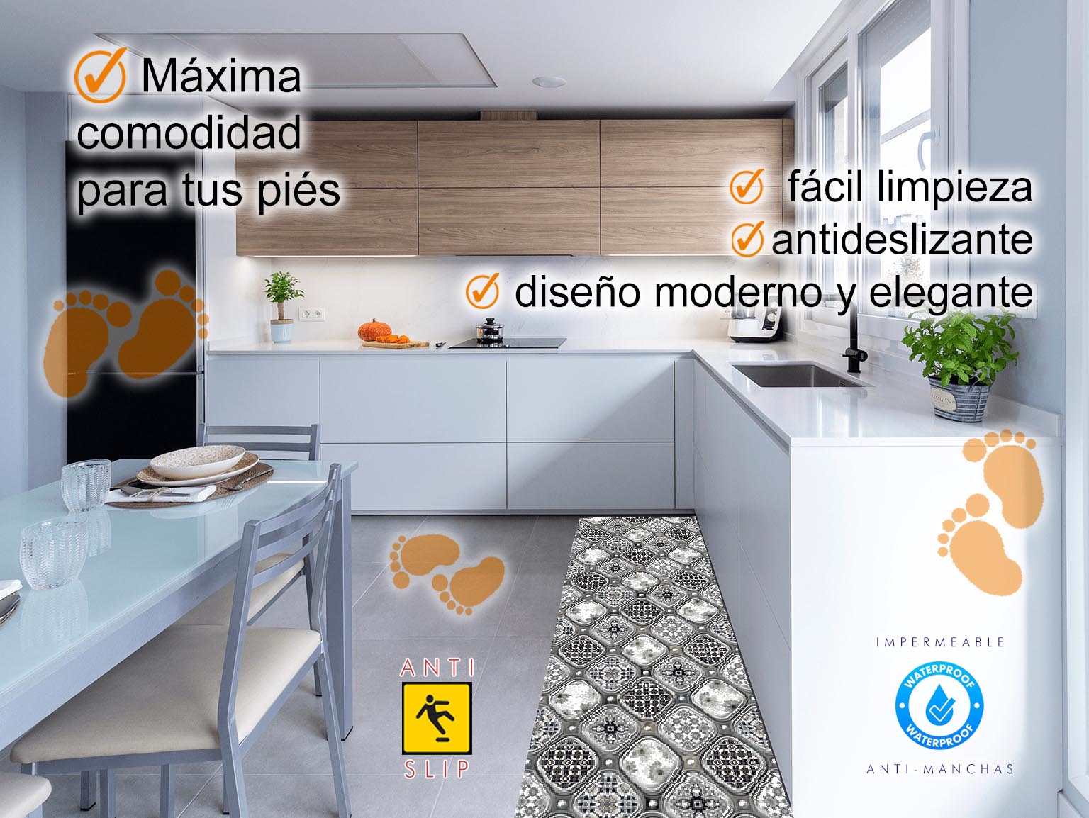Las alfombras de vinilo antimanchas son la mejor solución para decorar tu cocina, salón y pasillo sin tener que hacer ningún tipo de obra o remodelación, porque no necesitan instalación! Nuestras alfombras de vinilo no necesitan adhesivos, ayuda o herramientas para su instalación. Son aptas para uso infantil y de mascotas, por lo que son fáciles de limpiar utilizando agua y jabón. También puedes usar una bayeta o fregona para su limpieza. Además, son aislantes térmicos, resistentes al calor y antideslizante.