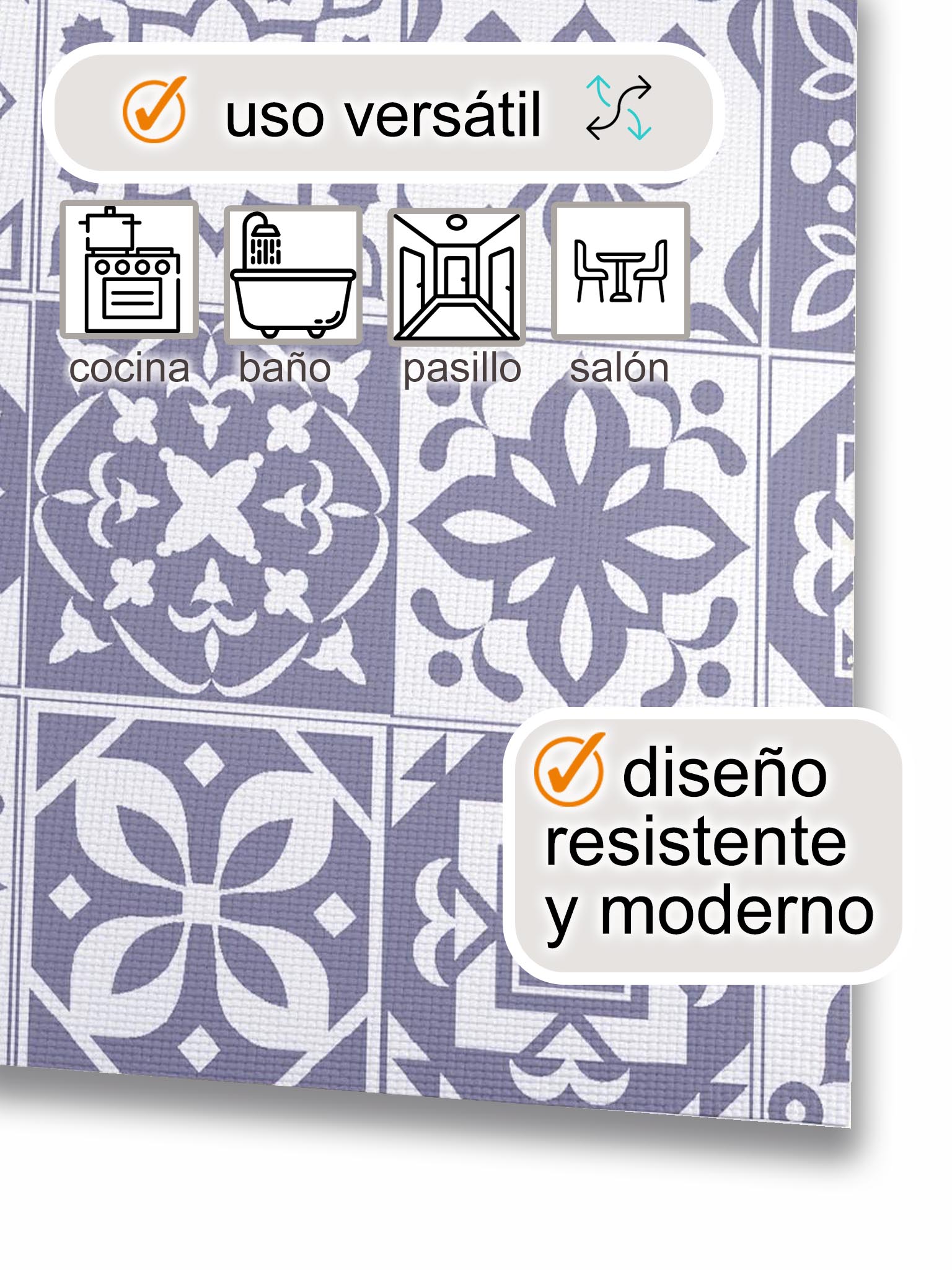 Las alfombras de vinilo antimanchas son la mejor solución para decorar tu cocina, salón y pasillo sin tener que hacer ningún tipo de obra o remodelación, porque no necesitan instalación! Nuestras alfombras de vinilo no necesitan adhesivos, ayuda o herramientas para su instalación. Son aptas para uso infantil y de mascotas, por lo que son fáciles de limpiar utilizando agua y jabón. También puedes usar una bayeta o fregona para su limpieza. Además, son aislantes térmicos, resistentes al calor y antideslizante.