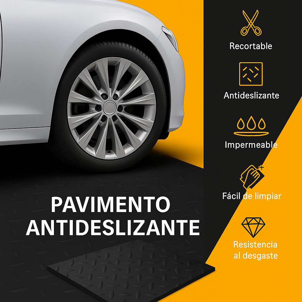 Suelo especial para transito de personas, es un pavimento de goma conocido como suelo de diamantes de color negro. Es un suelo Antideslizante. Ideal para taller doméstico, garajes, cocinas, terrazas…